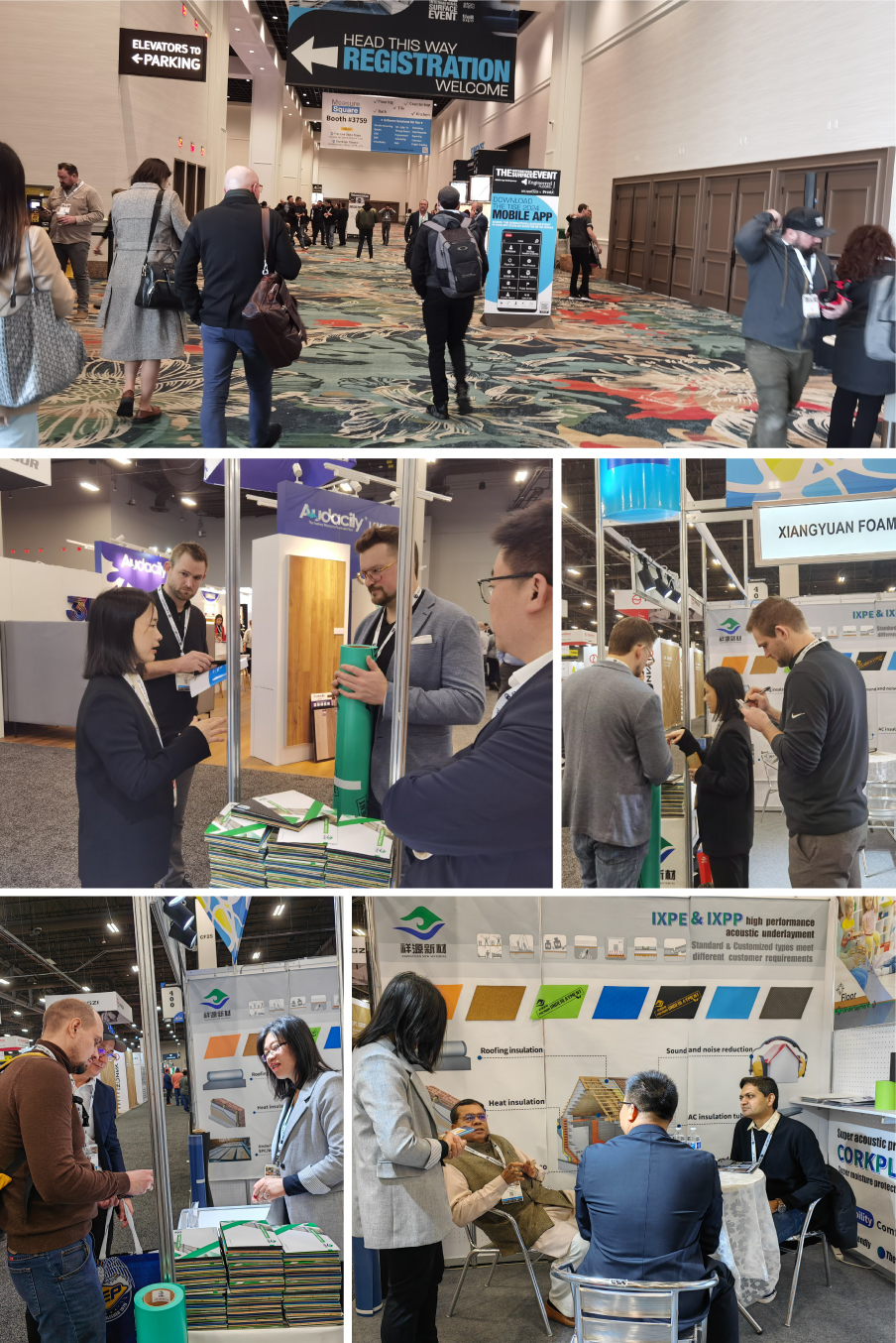 Xiangyuan International Trade Department went to the United States and appeared at the exhibition with a variety of flooring underlay (IXPE/IXPP) of different materials, microcellular polyurethane foam and a variety of floor material solutions.
